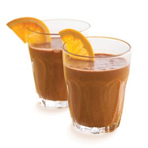- Humidifier le rebord de deux verres avec de l’eau. Dans une petite assiette, déposer la chapelure de biscuits Graham. Tremper le rebord de chacun des verres dans la chapelure, puis verser le smoothie dans les verres.